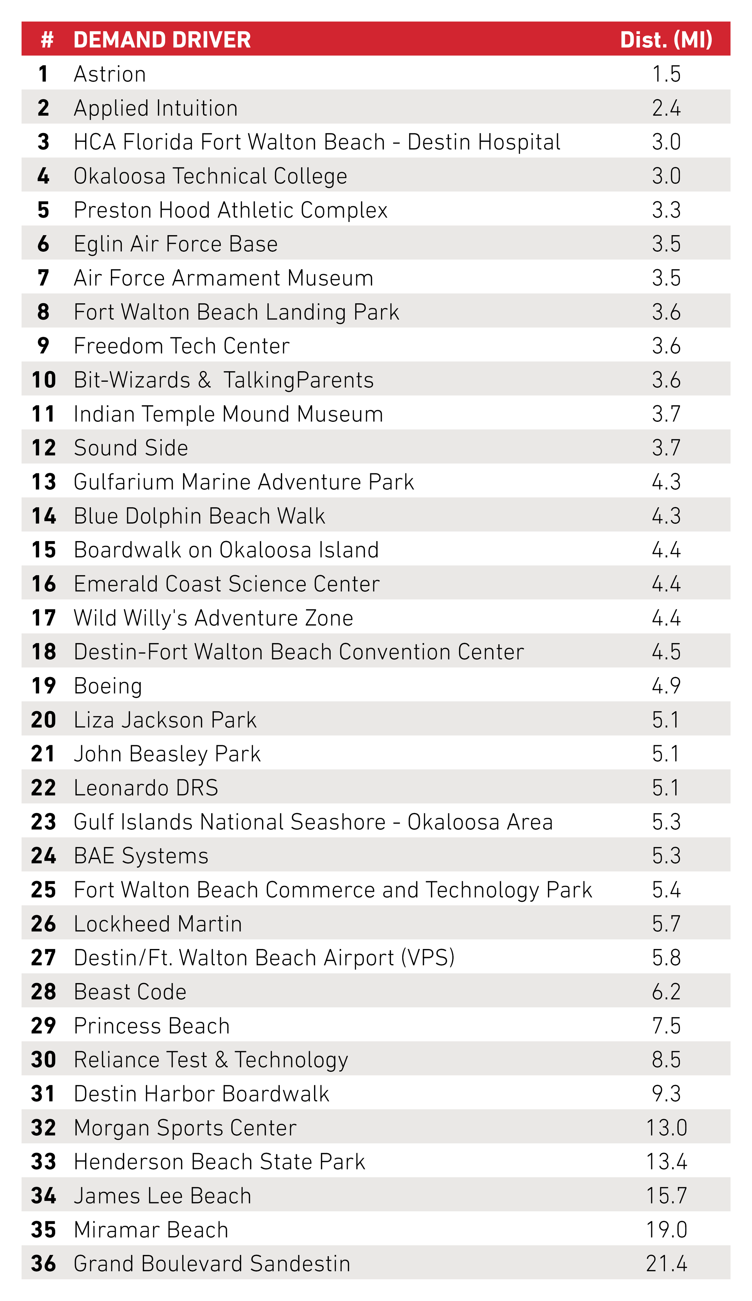 Situated between vibrant coastal attractions and major local institutions, the TownePlace Suites is well positioned to capture leisure, government, and healthcare demand, offering convenient access to destinations such as Okaloosa Island and the Emerald Coast shoreline. The Property is centrally located near Eglin Air Force Base and Destin-Fort Walton Beach Airport, which together serve as cornerstone economic drivers for the region, supporting nearly 13,000 jobs and generating approximately $2.7 billion in annual economic output. Additionally, the Hotel is close to the 331-bed HCA Florida Fort Walton-Destin Hospital, the only full-service hospital serving Okaloosa, Walton, and Santa Rosa counties.